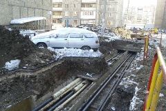 Машина им совершенно не помешала - они раскопали все вокруг нее. Теперь автомобиль попал в ловушку, выбраться из которой без посторонней помощи протсо невозможно! У владельца только один выход - заказывать кран, пока машина не свалилась в траншею. Ведь трубы у нас меняются тоже не за несколько дней.